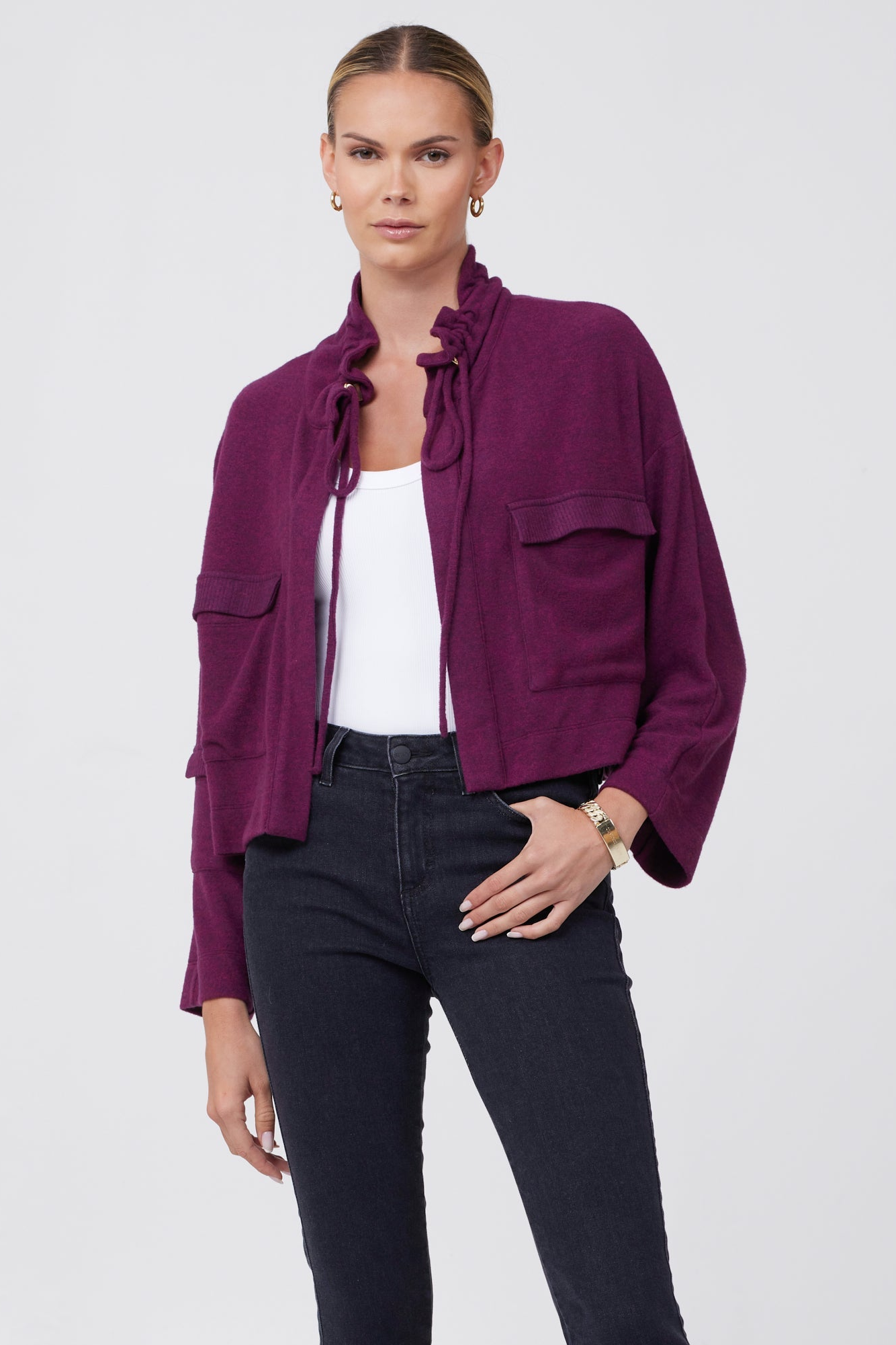 - The jacket has flap-style chest details that add a structured touch to its otherwise soft silhouette.